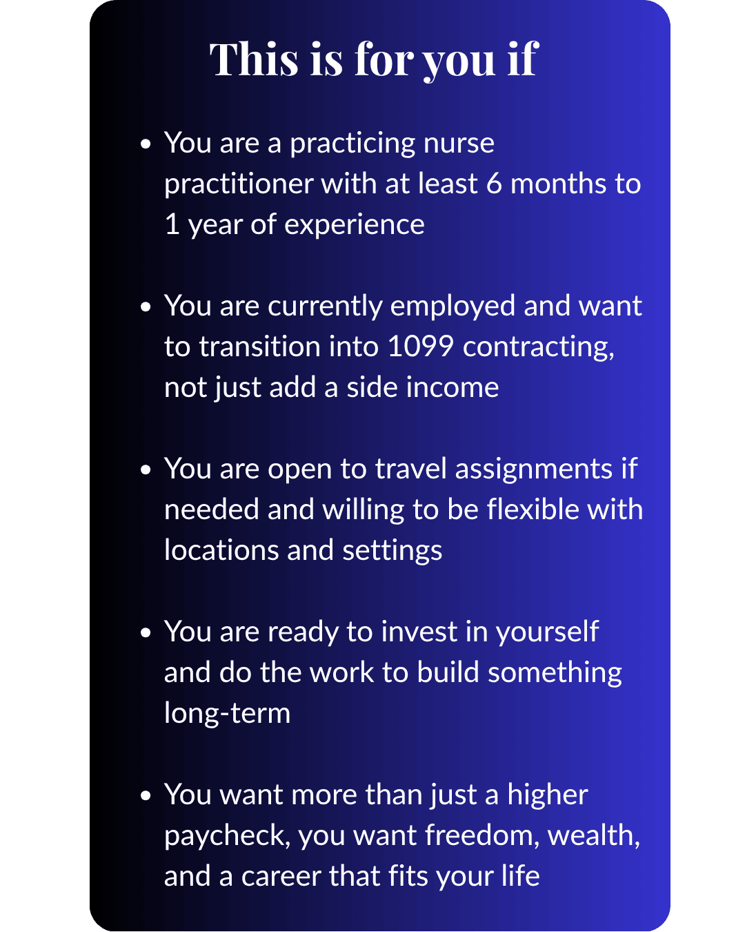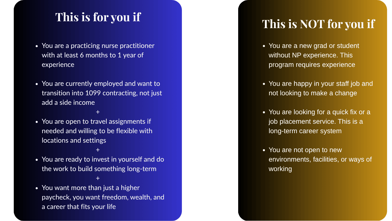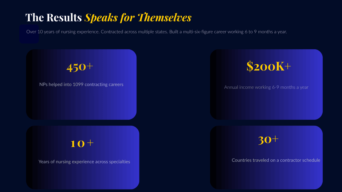 Four months in I quit. Two weeks later I landed my first 1099 NP contract in New York City. A six-month assignment. And for the first time in my career, I finally understood what freedom looked like as a nurse practitioner.